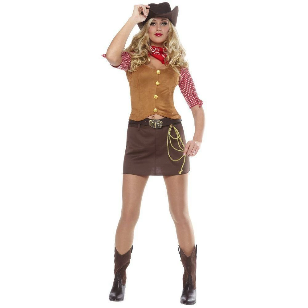 You may not be the fastest gun in the west, but you can certainly be the sexiest when you try our Sexy Gunslinger Cowgirl costume. This wild west-inspired costume has a brown skirt and tan vest, as well as a cowboy hat and bandana. The skirt comes with a matching belt, complete with a large bull head buckle and attached lasso. The vest is a rich tan shade with gold buttons.