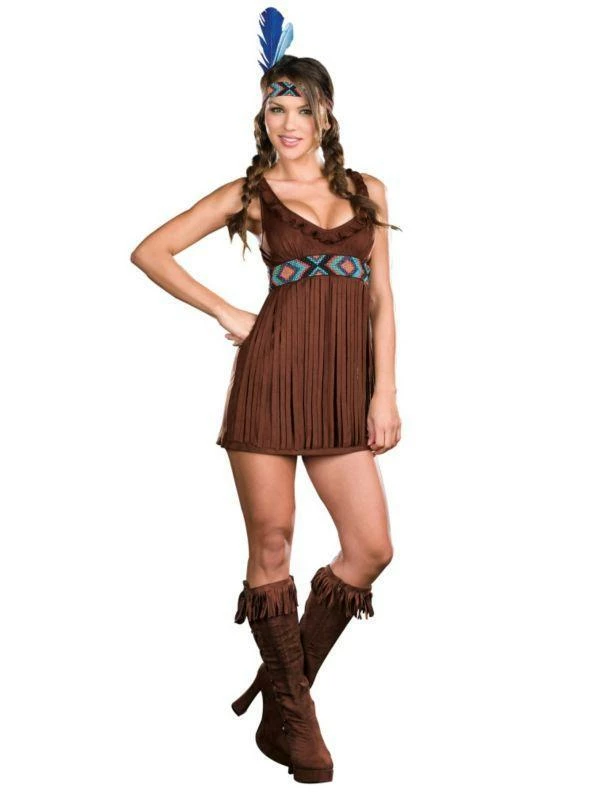 Our Tribal Princess Costume Tribal Trouble Stretch knit faux suede dress with intricate bead detailing on dress and head piece. Full fringe bottom. (2 piece set)Let this naughty native be your guide.