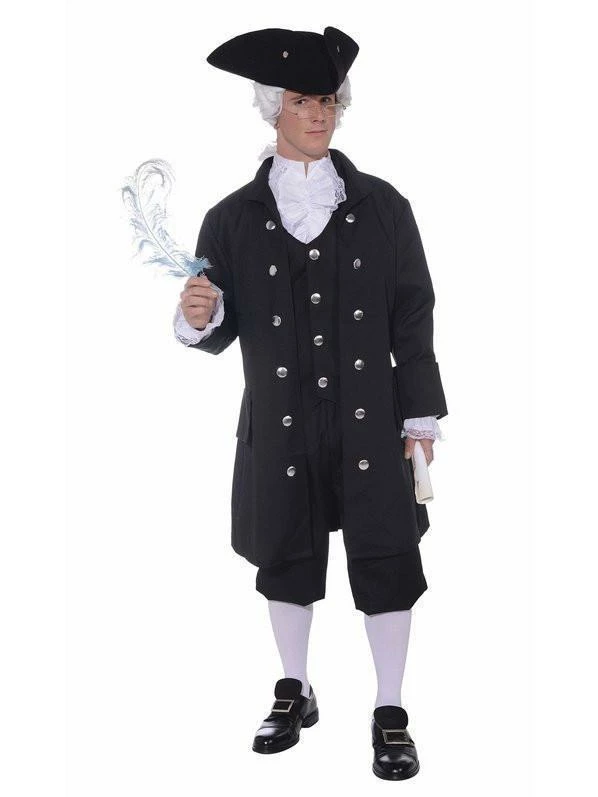 Whether you’re channelling Captain Cook, or a Dickensian character, this historical costume will see you doing it in style. The long black jacket falls to the knees and has two rows of silver buttons running down the seems, matching the buttons on the sewn-in black vest. The sleeves have a white ruffle lining peeking out from inside them to complement the lace-lined.