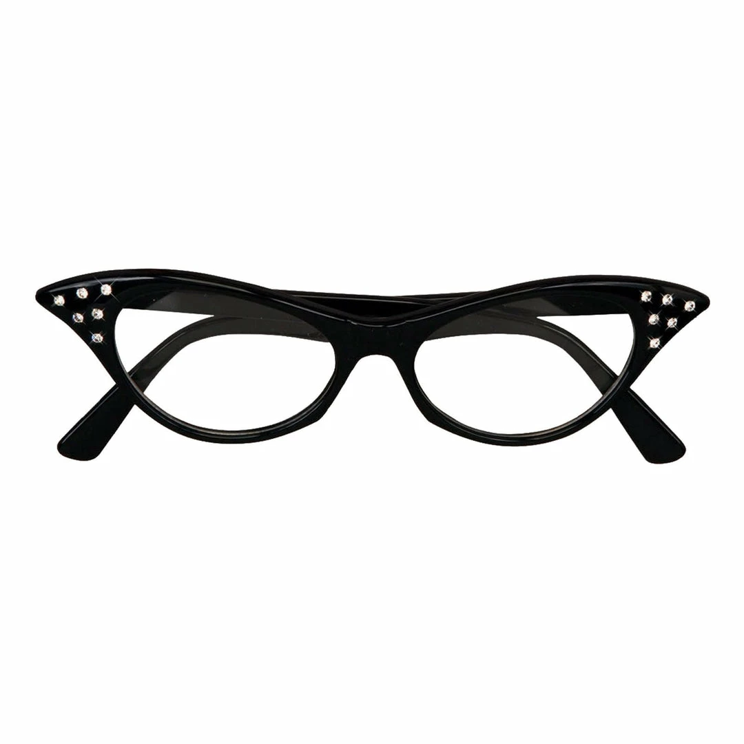 - Pair of thick framed black cat eye style glasses made from plastic