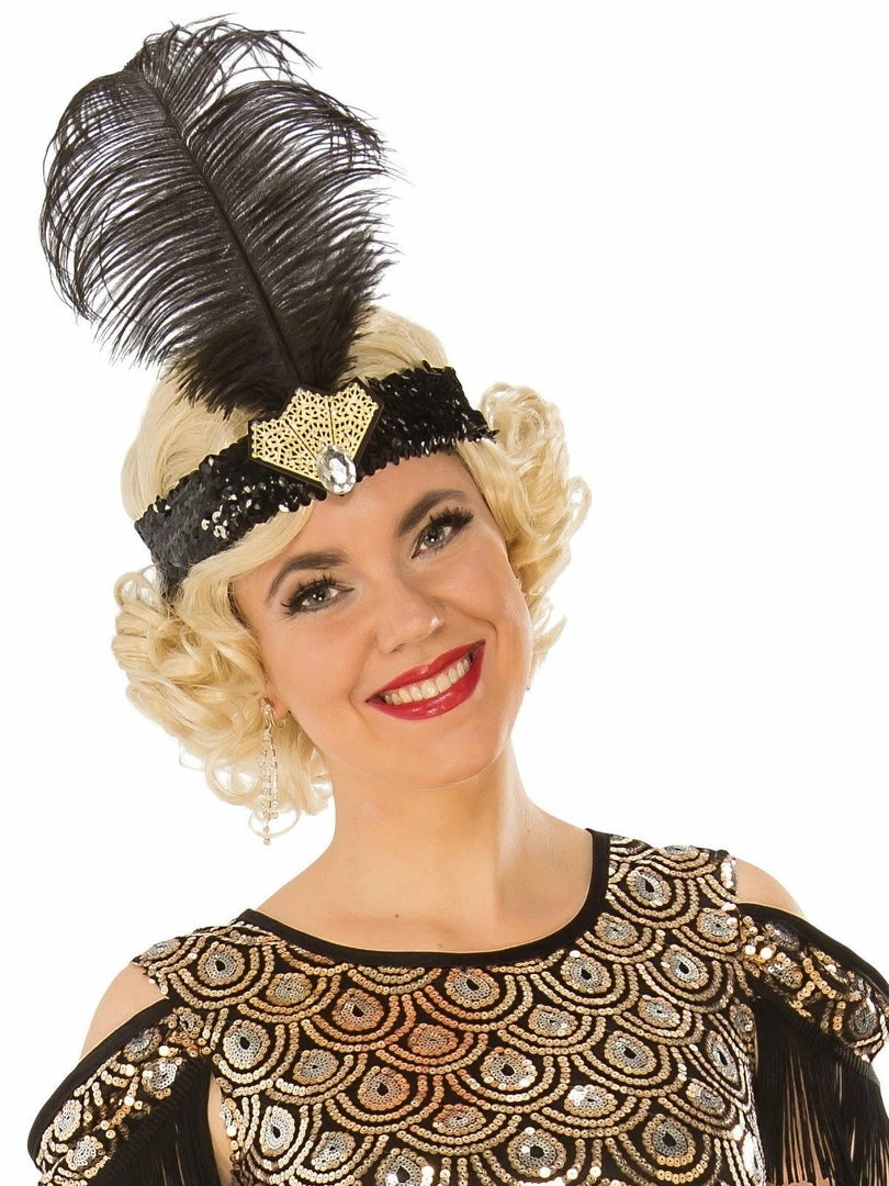 - Off the shoulder sleeves with sequin pattern and fringe embellishment on hem, plus sequin headpeice with gold pendant at centre with jewel embellishment and feather feature