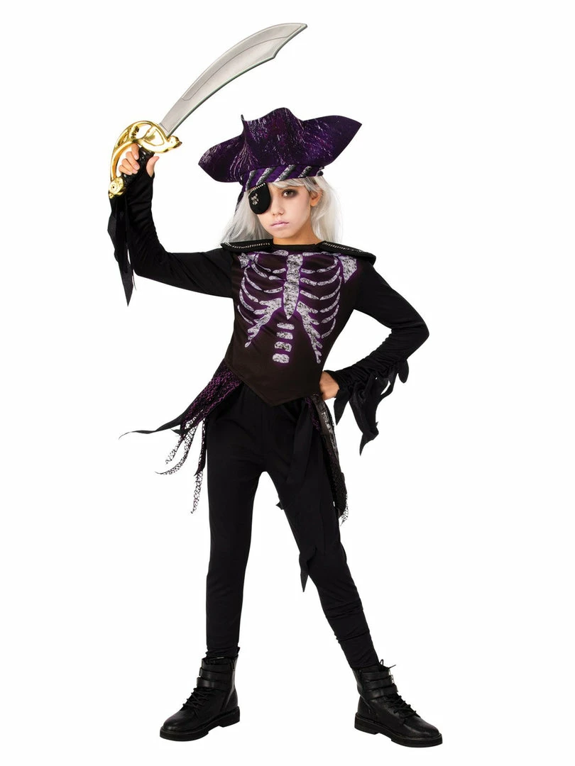 - Purple and black tri-horn shaped headpiece plus eye patch with elastic strap