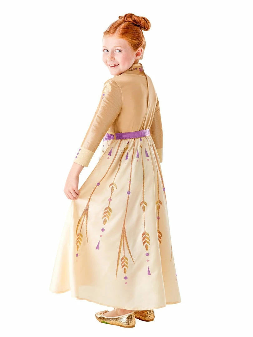 - Dress features digitally printed design in glittery texture on the front of the bodice and the full skirt in shades of gold, bronze and purple plus printed purple belt at front and velcro detachable belt piece at rear