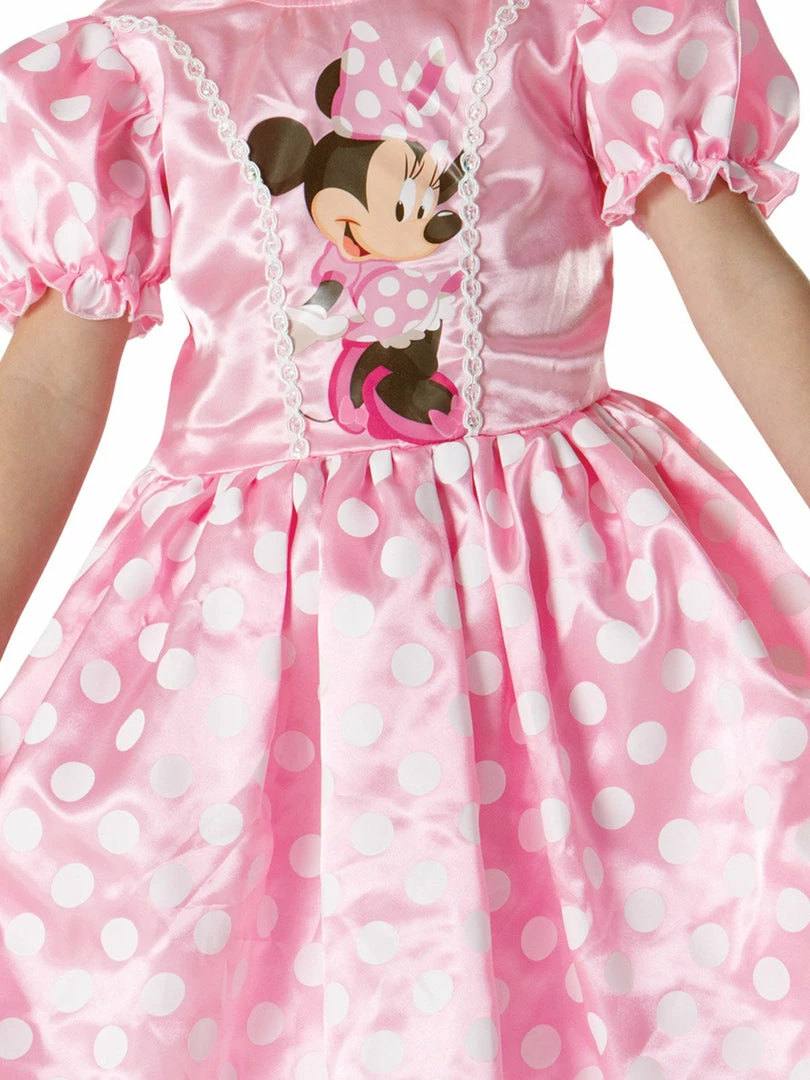 - Iconic Minnie Mouse dress made from satin material featuring trademark white spots on skirt and puffy sleeves. Centre of bodice features digitally printed Minnie Mouse print on satin material and stitched in panel with embroidered trim