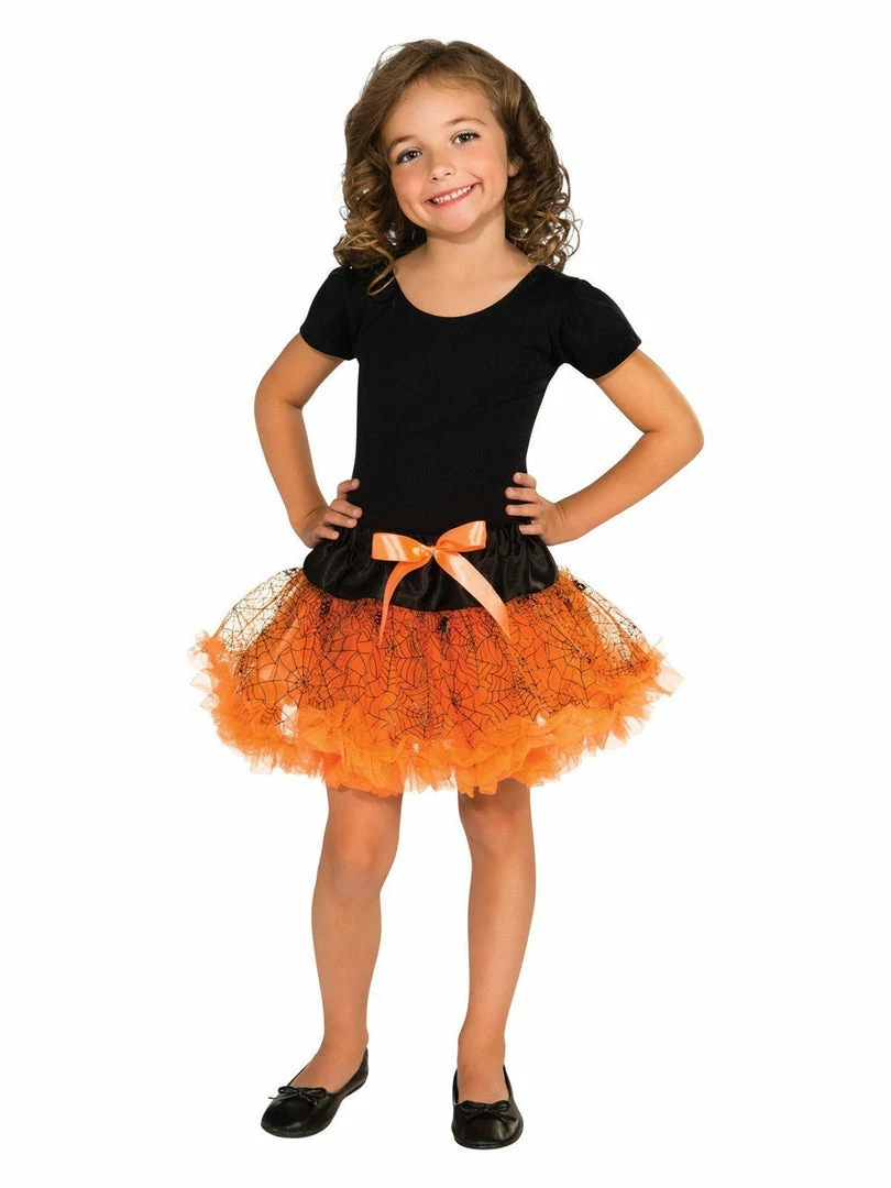 - Orange tulle trimmed mini skirt with black spider webbing print throughout