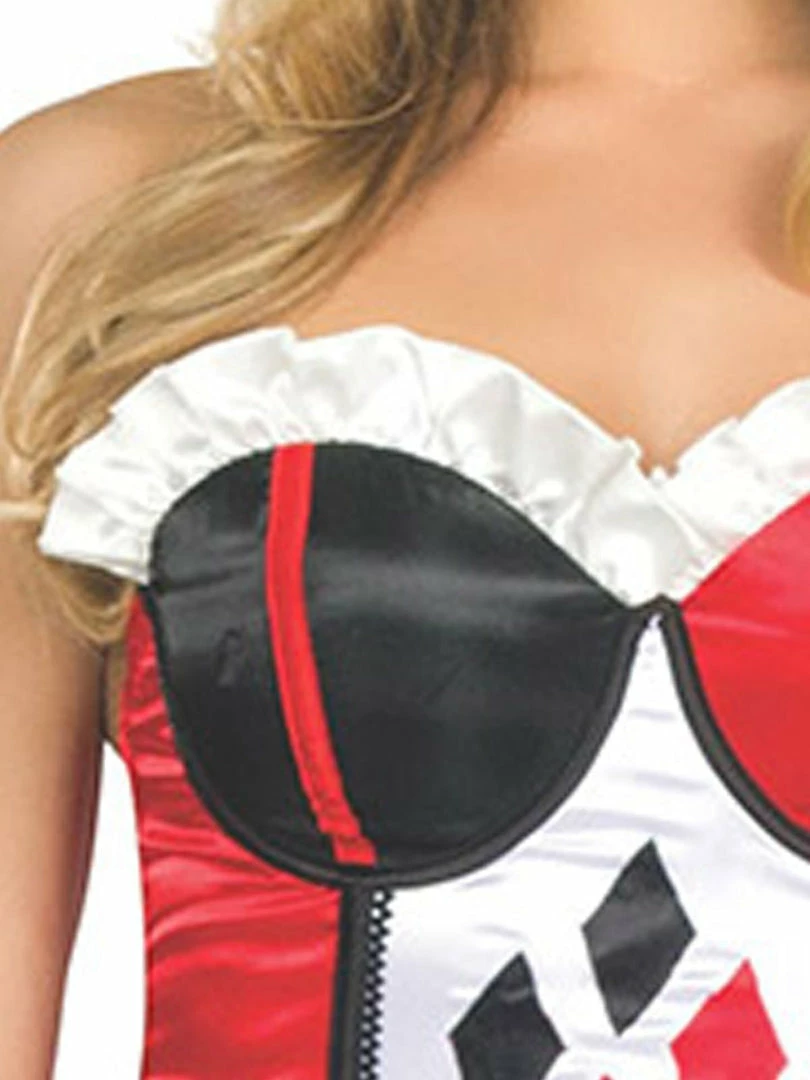 Sleek and sexy, become Dr. Harleen Quinzel (a.k.a Harley Quinn) psychiatrist intern at Arkham Asylum in this red and black Corset. Who needs a party? Wear it anywhere!