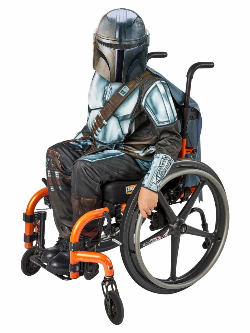 Set five years after the events of Return of the Jedi and 25 years prior to the events of The Force Awakens, Disney+ released Star Wars: The Mandalorian as a live action TV series in 2019. The story follows the title character, the Mandalorian bounty hunter Din Djarin, and his exploits beyond the reaches of the New Republic. Taking the world by storm, actor Pedro Pascal, also referred to as “Mando” was a foundling rescued by Mandalorians. “The Child” is a toddler at age 50 and is of the same unnamed species at powerful Jedi Master Yoda and needs to be delivered to “The Client” by the Mandalorian. This adaptive costume is designed to be wheel-chair friendly so now every little person can be a superhero!