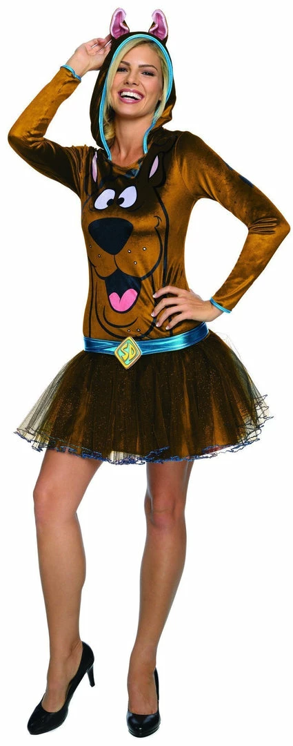 - Hooded tutu dress with satin metallic fabric on bodice and featuring digitally printed Scooby Doo face and spots, plus blue satin cuff ribbing