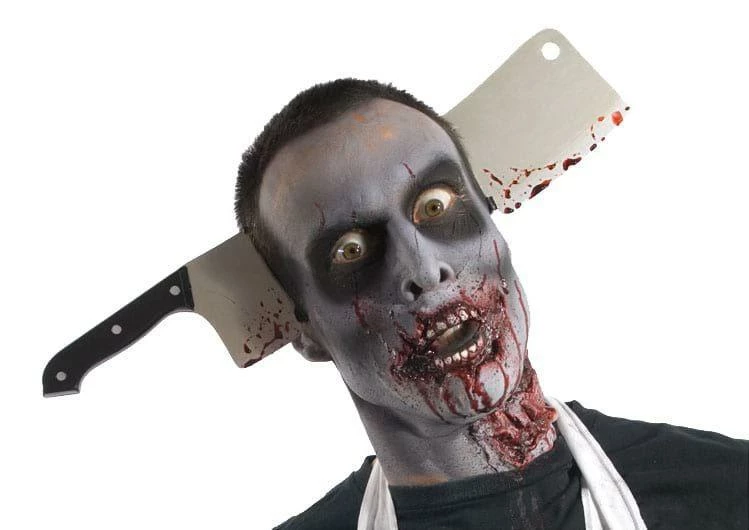 - Plastic blood splattered butcher cleaver on a hard plastic headband