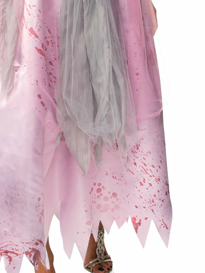 - Long pink and grey satin dress with tulle overlay and side bow plus tattered hem complete with digitally printed blood splatter on bodice, skirt and arms